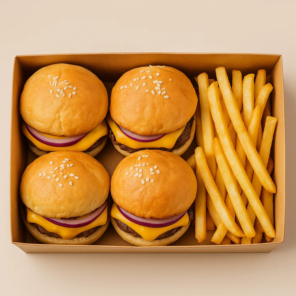 Булочка бриошь, две нежные куриные котлеты, сыр чеддер, помидор, салат Айсберг, горчичный соус, лук, огурец соленый.